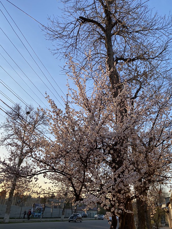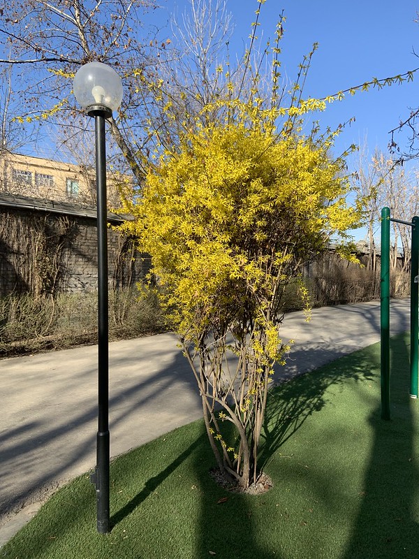 We’ve had an unusual run of extremely warm weather this month. A couple of days ago it reached 26 C (79F) and it felt like summer. The apricots and cherry blossoms are out all over the city. Forsythia, the yellow trumpet of European spring is also in full bloom on campus (see below). It is supposed to snow later this week again. 😦