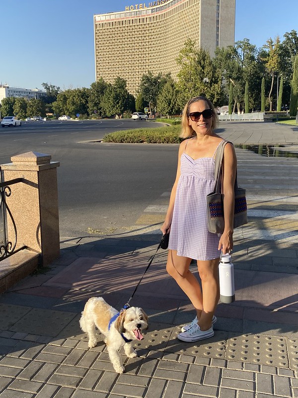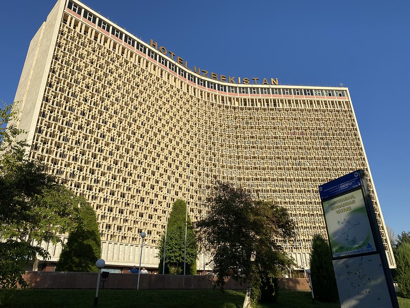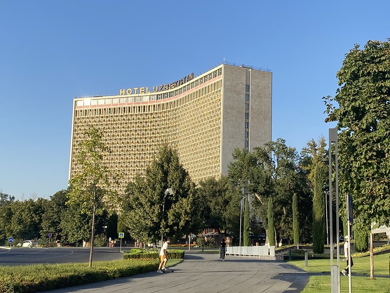 I love the architecture of the Hotel Uzbekistan, one of the best examples of the Soviet’s fascination with Brutilism. This term comes from the French language meaning “exposed concrete”. The style was popular with architects from the 1950s to the 1980s. Besides the exposed concrete look, it also specialized in geometric shapes. The Hotel Uzbekistan is in the shape of an obtuse angle, and the distinctive building completed in 1974, has interlocking cement squares which provide shade to the facade. It was a classic Tashkent stifling hot August afternoon on Sunday and near sunset, Nadia and I took Obi out for a walk. The setting sun on the facade of the hotel contrasted with the blue skies and green of Amir Temur Square combined for a splendid view.
