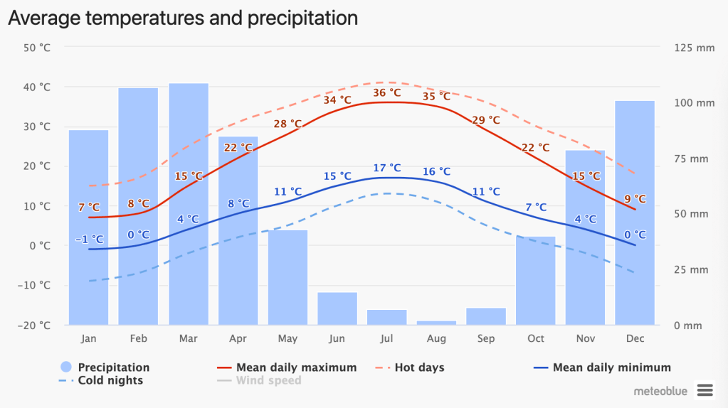 As you can see from the chart above, Tashkent summers are dry and hot. Most of the precipitation falls in the winter and spring. We basically get, the opinion of someone who grew up in Northern Michigan, three months of winter (December, January, February) with off/on months of April and November. October and AprilMay are perfect weather