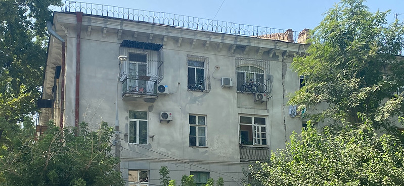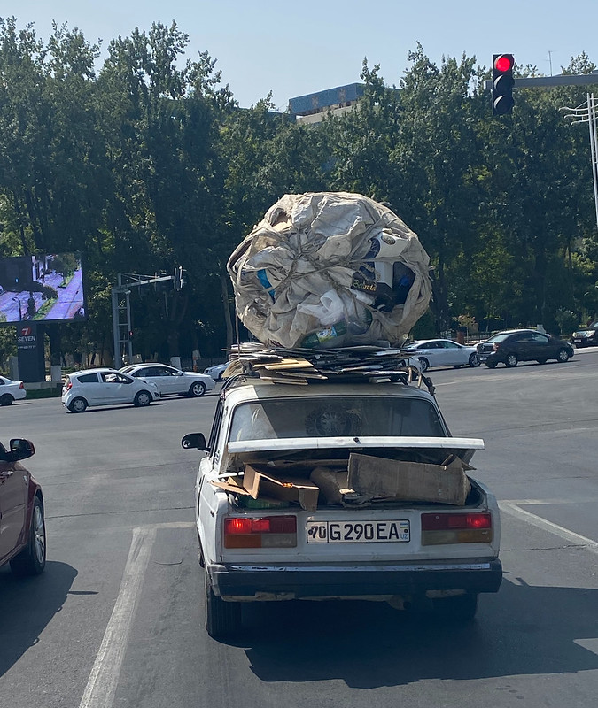 I appreciate life in Tashkent and am trying to capture moments in my regular day. There is a small bakery and somsa restaurant (middle) that I walk by on my way to school in the mornings. We buy bread there and when it is fresh and hot, delicious. I spotted this car hauling plastic and paper for recycling. Because of the low incomes in Uzbekistan, plastic and paper recycling is viable and you see people collecting in garbage areas all over the city. A Luli (Roma) family was in the car (right) and it is a vital source of income for many Luli. The Soviet era apartments are quite small and people need to be creative to maximize the space. I liked the bicycle storage in the windows of the third floor.