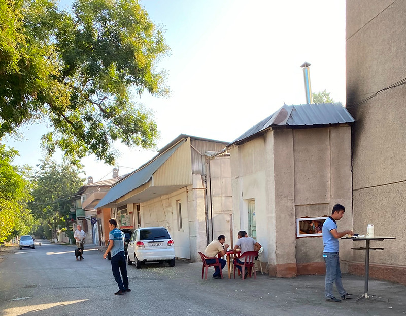 We went for breakfast at Breadly afterwards and then shopping at Kanishka, a high-end leather shop on the boulevard of the bakery. I bought a new wallet and computer bag, as my current bag is over 20 years old and is falling apart. The prices for leather in Tashkent are inexpensive and hopefully, it will last as long as my last bag. I love walking in that part of the city close to NBU stadium. There are lots of mature trees and old apartment blocks with interesting facades. The Uzbek sunshine creates beautiful lighting. The extremely high temperatures of last week (100F+) are cooling this week and as I write this at 8:30 AM, it is a perfect 72F. I drove Oliver to his friends and back, did some grocery shopping and took Obi for a walk in the late afternoon.