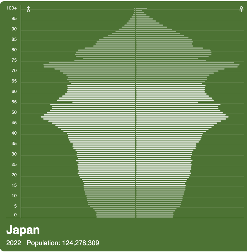 The demographics in Uzbekistan are much different from my previous school in Osaka, Japan, and much of the Western, industrialized, developed world. As you can see below in the pyramids from Population-Pyramids.net, the Japanese population pyramid looks much different and presents countries with different challenges. In Uzbekistan, the problem will be finding jobs for the big cohorts moving through working age, especially the 0-9 cohort. Japan is in trouble because it will have a decreasing number of working people to support a top-heavy, retired cohort. The USA looked like Uzbekistan in the 1950s and 1960s, but fortunately, through immigration, the USA has been able to have a stable cohort of younger workers coming up through the system, unlike Japan.