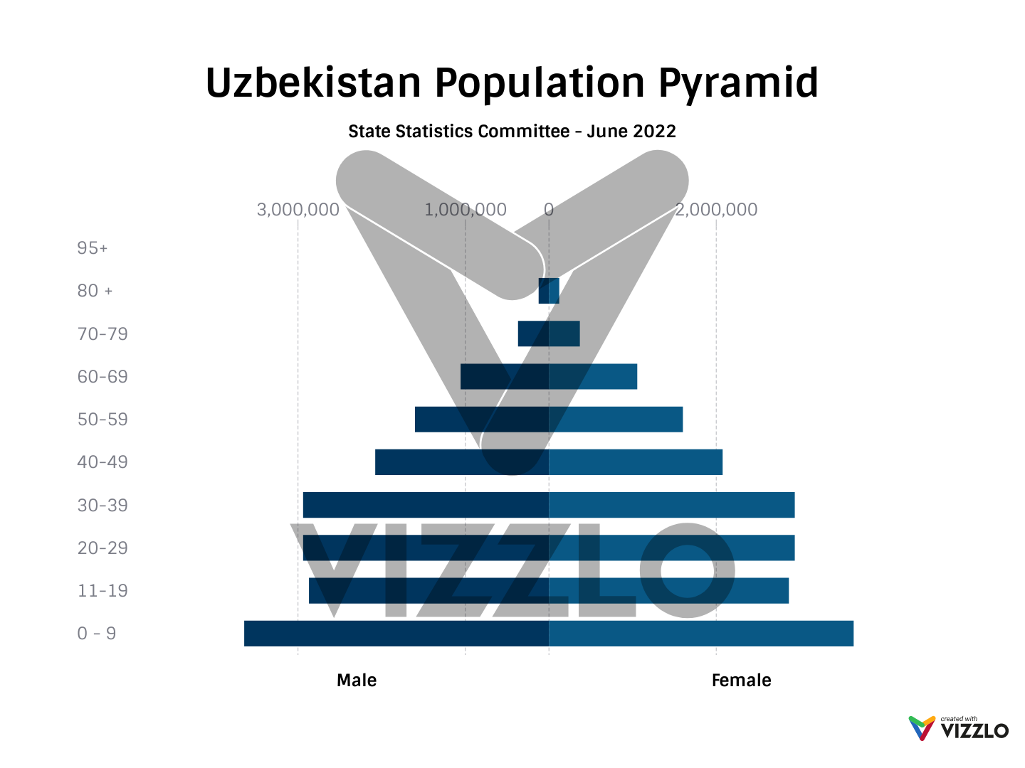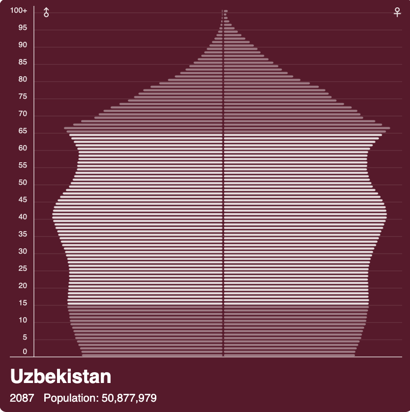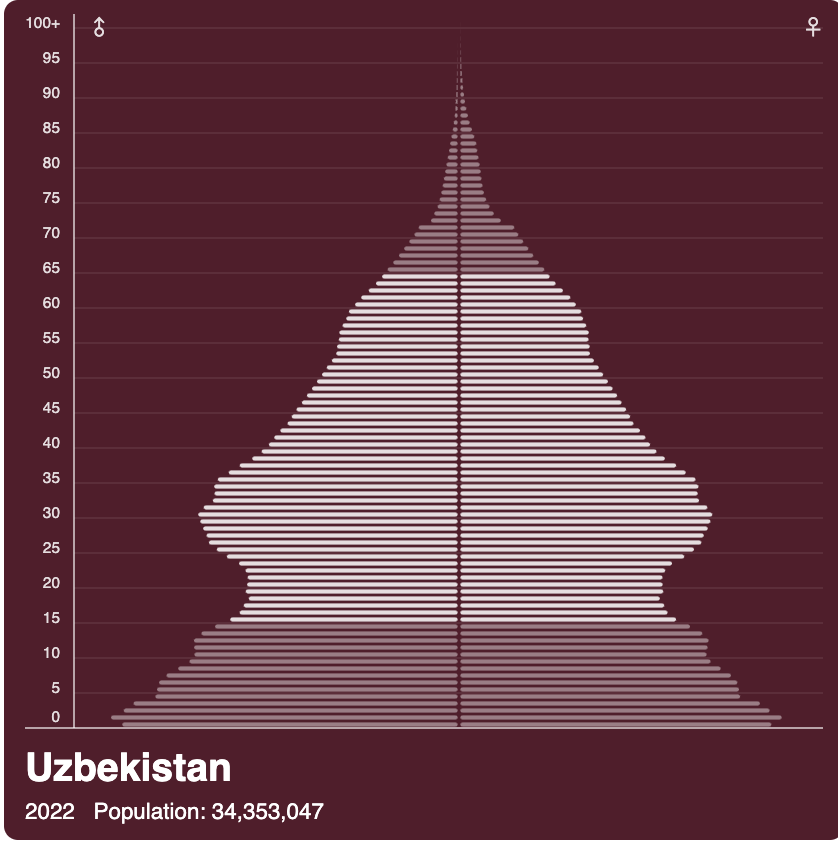 This summer, I have been interested in demographics and the role it plays in the culture, economy, education, and future implications. What sparked my interest was the release of population data last month from the Uzbekistan State Statistics Committee. I used Vizzlo to convert the data into a population pyramid. Uzbekistan is a very young country, and as you can see, the bulk of the population is under 40, and very few older people. I was especially taken aback by the fact that 60% of the population is under 30 years old. The total population of Uzbekistan is between 34-35 million people so that is over 15 million young people. No wonder there were fewer deaths in Uzbekistan than in more developed countries.