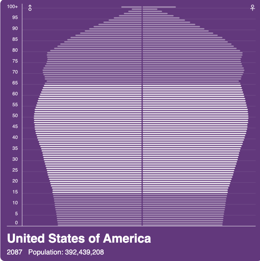 I also listened to the Sam Harris podcast interview with Ian Bremmer and Peter Zeihan “The End of the Global Order.” Bremmer and Zeihan are experts in global politics and they both said China is in trouble because the 1-child policy has warped their population pyramid. They will be facing a huge retirement cohort and few workers to support them. The population will be half (700 million) in 2100 what the population is today. The population pyramid website that a neat feature that projects the populations into the future. Here are some countries in the year 2087. I picked 2087 because that is the peak year of retirees in China. Looking like a mushroom is not good. It will be fascinating to see how humanity reacts to declining populations in most nations over the next couple of centuries.