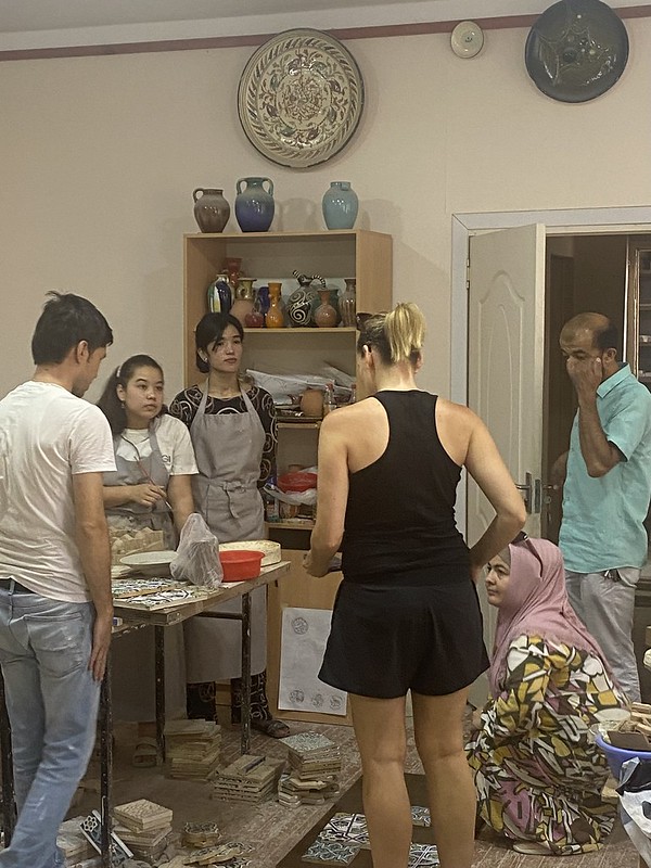 Patterned ceramic tiles are a big deal in Islamic architecture. Nadia is looking for tiles to put in a coffee table she is designing so we stopped a the workshop of a friend. It was located in an old school building . They were working on the tiles for a new Islamic library that is being built here in Tashkent. As you can see in the photo on the far left, the intricate patterns require many tiles. The scale of the building is immense. One of the masters is holding up one tile in front of a diagram of that one portion of the library wall. We found a couple tiles we liked although they were charging us a bit too much, so Nadia will continue looking for some less expensive tiles. It is cool that there are ceramic workshops like this throughout Uzbekistan.