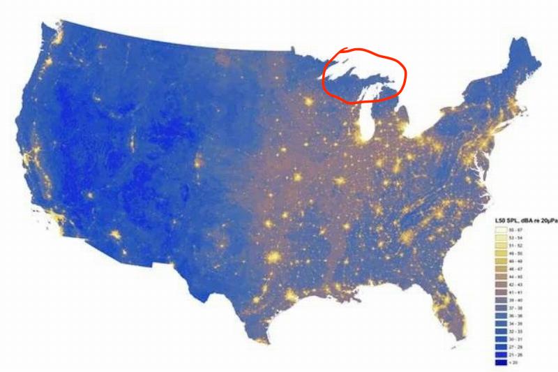 The UP reminds me of Winterfell and the North in HBO television series, Game of Thrones. The long, harsh winters forge an identify on the people and landscapes of the region. The bitter cold keeps most people away, and unlike the western and southern parts of America, the region is actually slightly depopulating. Lake Superior, the largest freshwater lake in the world is approximately the size of the state of Maine, and acts like the Wall in the Game of Thrones. I guess that would make the Canadians the “wildlings.” 🙂 As the two maps below demonstrate, there are a lot of trees and not much noise or light pollution in the peninsula.