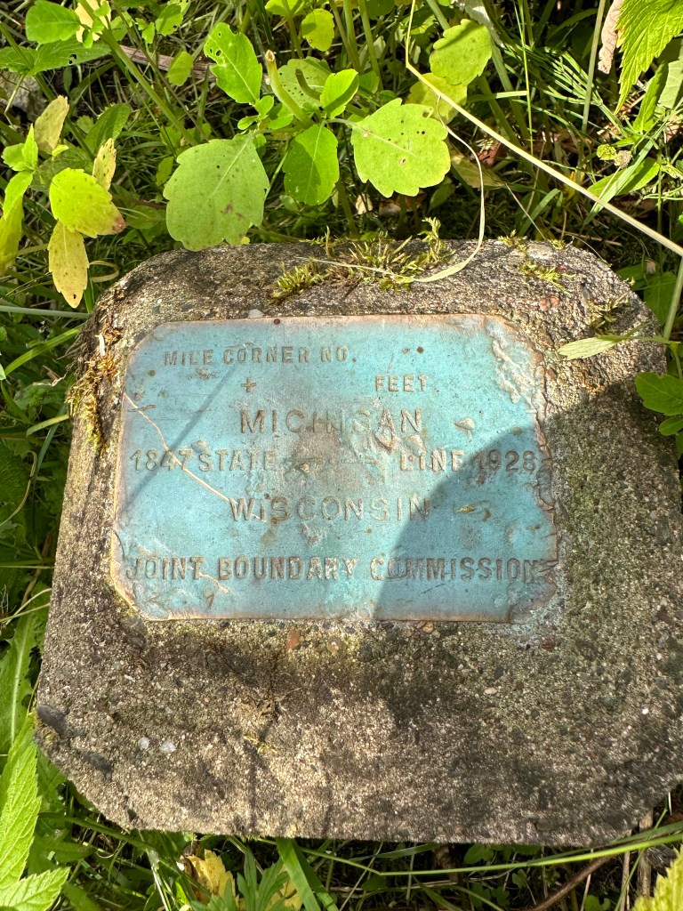 William A. Burt came back in 1847 to make it official and a monument is in place marking “Mile Zero”, which is the start of the land border between the Brule River, going to Lac View Desert and continuing to the Montreal River and eventually Lake Superior. In 1928 a Joint Border Commission put in the plaque below. The site is maintained today near a state campground. We had to clear some vines that were covering the marker.