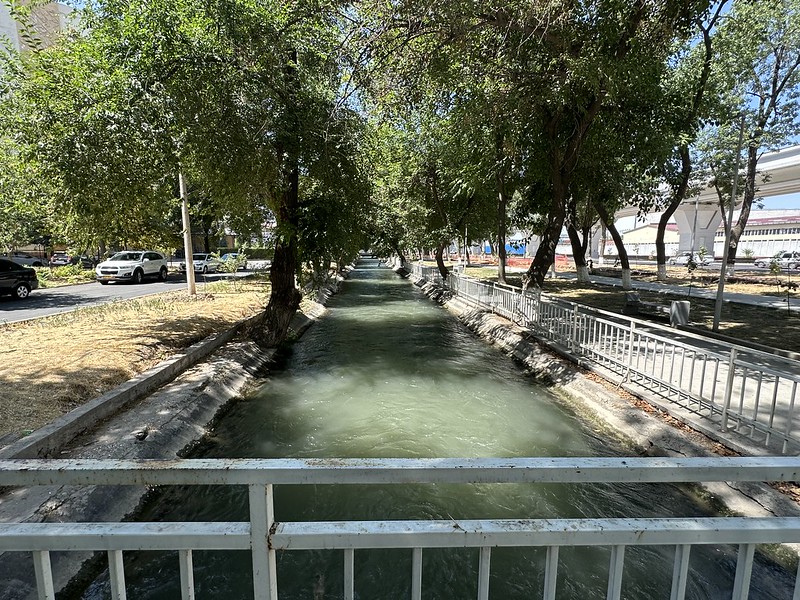 I am enjoying getting back into the routines of daily life in Tashkent. Nadia and I went shopping at the Mirabad market on Sunday. Plenty of delicious fruits and veggies, and we bought some pork cuts from the Russian butchers. We went looking for a natural gas grill and only found imported grills for $700+. We are looking for a smaller grill for a much cheaper price. I am cycling again in Tashkent, and on Monday rode along one of the side canals in the city to avoid traffic. The Russians made canals through Tashkent and today they are good places for walking. I noticed the ropes hanging off the bridge (below) into the water. The current is very strong and if someone is in trouble, they could save themselves by grabbing onto the ropes. A good idea.