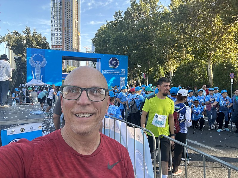 On Sunday I participated in the Yangi Nafas (New Breath) 10-kilometer race here in Tashkent. Yangi Nafas races were held in 16 cities around Uzbekistan to celebrate Independence Day. It is an appropriate name as Uzbekistan is a young country (32 years) and 60% of the population is under 20 years old. The Uzbek Athletics Federation used the slogan, “One country, one start, one distance, one goal – we run together”. I think mass races are a custom left over from the Soviet Union to celebrate anniversaries or big sporting events.