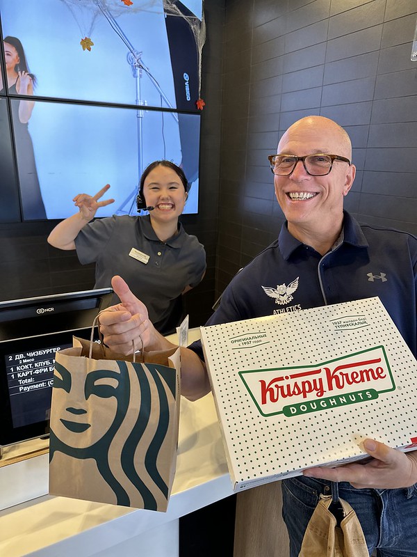 We also made the mandatory stops at American franchises that have not made it to Uzbekistan yet. Starbucks (gifts), Krispy Kreme, ate a Papa John’s pizza and a quick meal at the restaurant formerly known as McDonald’s. I say “formerly known as” because McDonald’s pulled out of Kazakhstan when they had supply chain issues due to sanctions on Russia. The restaurants are still here in Almaty, but the Golden Arches are taken down, and all references to McDonald’s are wiped from menus, drive-thrus, etc. It is now known as “Food Solutions KZ” with a new branding campaign coming soon. The double cheeseburger, fries, and strawberry shake tasted similar to the McDonald’s all Americans know. We also went to a supermarket to buy nacho chips and a few things Nadia could not get in Uzbekistan. We spent the rest of the day in the hotel room. I exercised in the gym and later went for a run along the Esentai River (весновка) in Russian as there was a running/biking trail.
