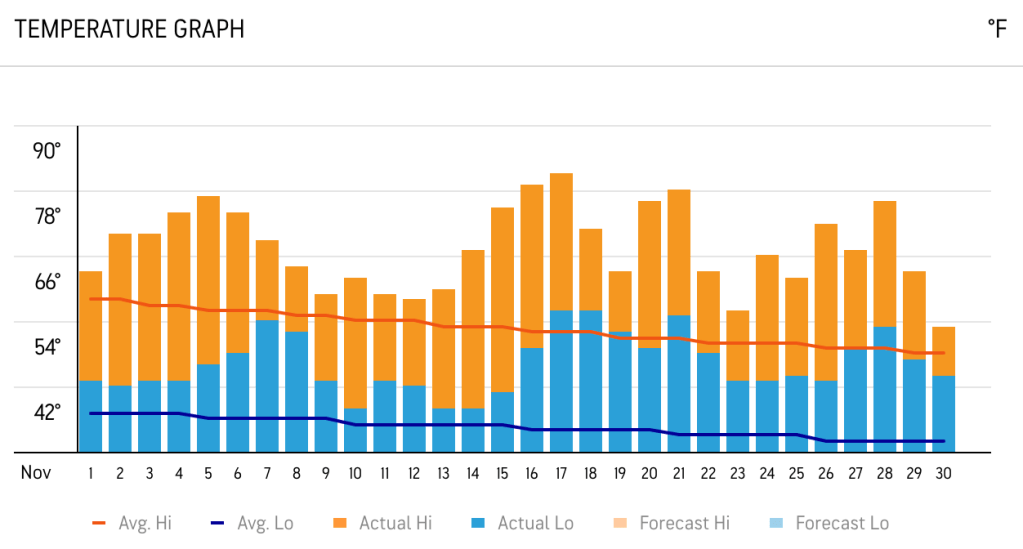 It finally feels like winter is here after an unusually warm autumn. Temperatures are dipping down to 4C (39F) at night. Temperatures in the afternoon peak between 10-18 (50F-64F). The months of October and November in 2023 were fantastic and probably some of the warmest months experienced here. Below you can see temperatures were well above average for both highs and lows for the month of November in Tashkent. Tashkent has a Mediterranean climate with rain/snow falling mostly November to March. I am turning into my father, very interested in the weather…