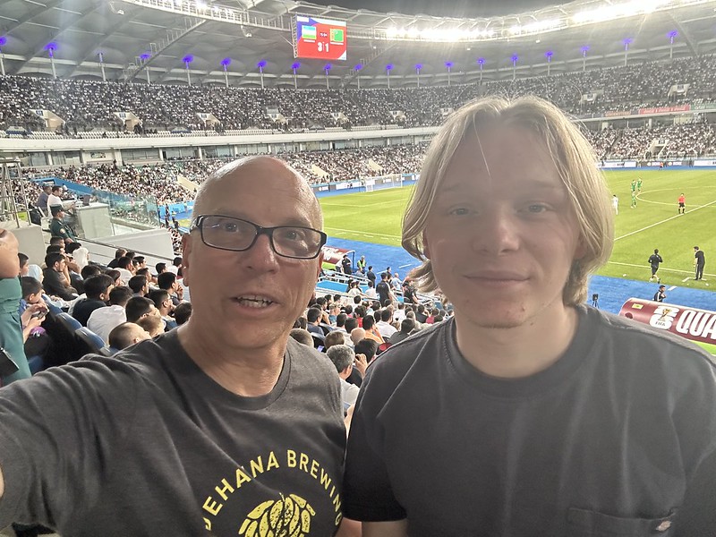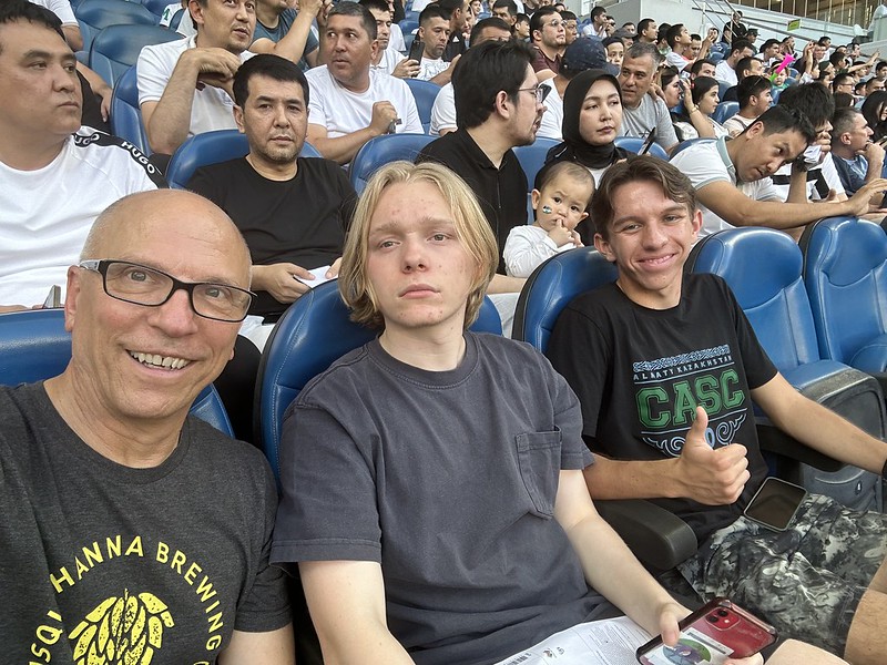 Oliver and I attended the Uzbekistan versus Turkmenistan Asian Football Confederation (AFC) World Cup Qualifier Match last night at Bunyodkor National Stadium in Tashkent. Uzbekistan was the clearly better team and dominated for a 3-1 victory. The stadium was almost full and the highlight for me was to spend time with my son and his friend Tristan. Oliver loves soccer and I was pleased to help us go to the game. It was a bit of a hassle to find parking, enter the stadium and find our seats, but overall, it was an entertaining experience.