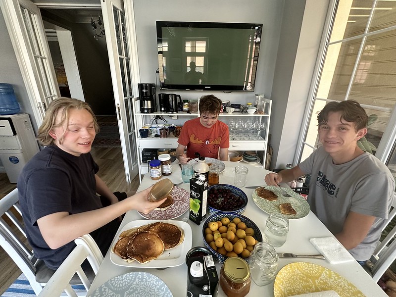 I love the sound of kids at our house and it was with pleasure that we prepared a pancake breakfast for Oliver and his friends who slept over on Friday night. International school students are so nice that they tidied the pool area and kitchen after the party. Oliver is with two of his best friends, Anton and Tristan. Nadia and I savored the opportunity to talk with them.