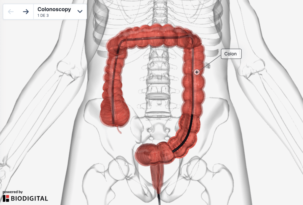 What are the risks of colon and rectal cancer? The American Cancer Society (ACS) puts males at 1 in 23 (~4%) of contracting colorectal cancer in their lifetimes. There are over 150,000 cases of this type of cancer diagnosed annually in the USA. The number of deaths is decreasing because people are more aware of screening. ACS recommends regular colorectal cancer screening from age 45 to 75 for people of average risk. There are different screening tests. Three only involve sending in a stool sample. The other three are visual examinations. The most thorough screening is a colonoscopy where a doctor inserts a tube the width of a finger into the anus, through the rectum, and all the way to the end of the colon. Thankfully this is done under sedation and is painless. (see diagram below)