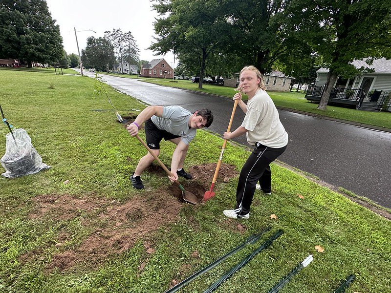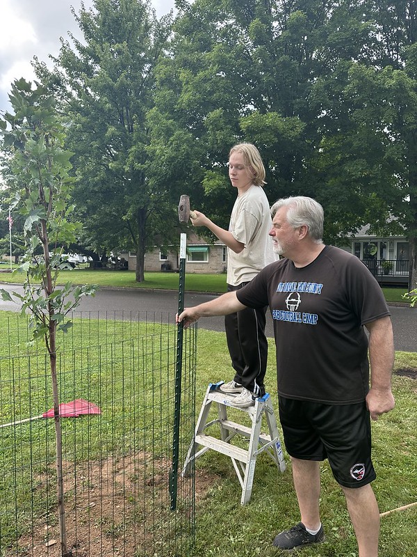 We planted three trees yesterday in our front yard. Two Northern Red Oaks (Quercas rubra), a type of Oak that can withstand the colder temperatures of Michigan’s Upper Peninsula. My village of Caspian is located at 46 degrees north latitude. I also planted one Sugar Maple (Acer saccharum). This was the first time doing this and I would probably give us a grade of “C”. The western Upper Peninsula ground is quite rocky and it was difficult to pound the poles into the soil. We need to protect the trees with fencing because deer will eat the young leaves. I am curious to see if they will survive and for how long. Hopefully, my children and grandchildren will enjoy the shade and autumn color they will provide and wildlife will be sustained by the trees fruits and seeds.