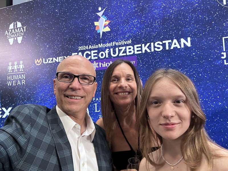 I took Nadia and Ocean to the “Asian Model Competition: Face of Uzbekistan – 2024” model and fashion show on Saturday evening. It was our first time attending a fashion show and it was delightful to be on the front row near the end of the runway. It was a combination fashion show and a reality TV modeling competition. Three of the 24 models (12 male and 12 female) were selected to represent Uzbekistan in the October final competition in Seoul, Korea. The event is sponsored by UzNex (Uzbek crypto currency) and it was led by the Korean Modeling Association. Similar events are taking place in 41 countries all over Asia to select models to participate in the October finals in Seoul.
