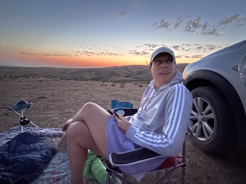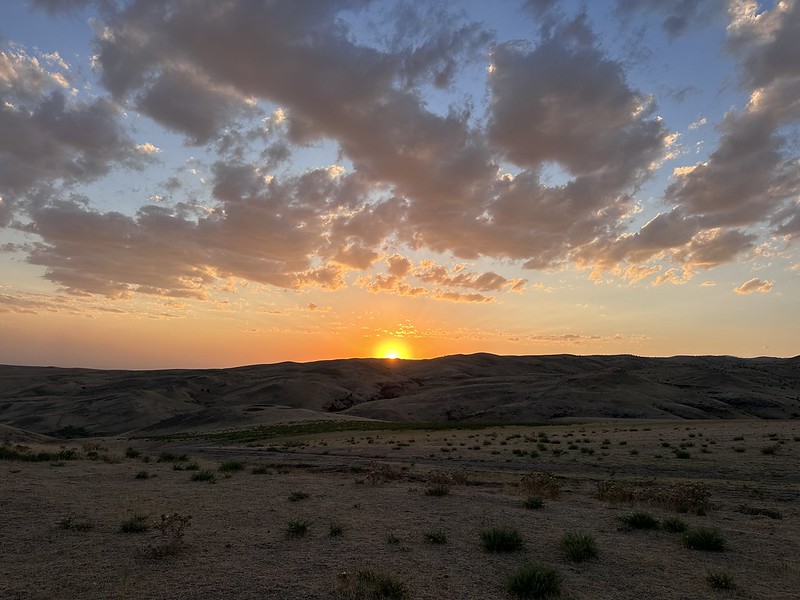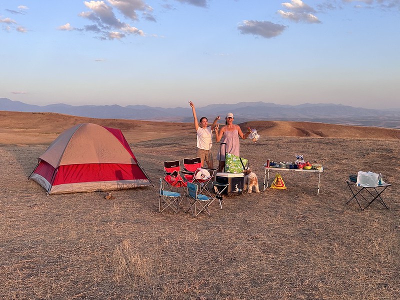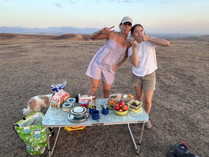 The night was delicious with a warm breeze and a sky full of stars. We listened to music, talked, watched satellites and shooting stars, ate and drank well, and overall had a great bonding experience. We slept OK without any interruptions from sheep dogs, foxes, etc. It is awesome to walk on the ridge, overlooking the town, with a breeze on my face, and looking up at the wonderful universe. It is so different from being at home and a refreshing break from Tashkent. Nadia purchased the complete “glamping” gear, ranging from a set of Hydroflask camping dinnerware to Russian brands of air mattresses and tables. We did not want for any home conveniences.