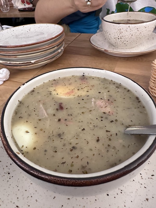 I had a delicious sour soup Źurek for lunch. It is made with a fermented rye starter and served with boiled eggs and white kiełbasa sausage. I definitely want to have a bowl of that today, my last in Warsaw.