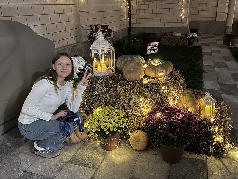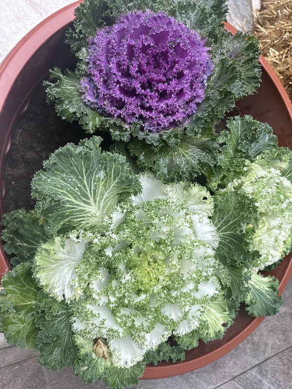 Nadia made some nice autumn displays in the garden. With the colder weather approaching and the summer basil withering out, we switched to colder-weather plants, including ornamental kale, hardy chrysanthemums, and pumpkins. Nadia loves the seasons with few hay bales and lanterns, has turned our patio into a fall garden. Chrysanthemums originated in China and have become garden favorites all over the world because they bloom in November.