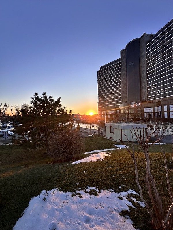I love to celebrate solstices and equinoxes. I feel the entire Northern Hemisphere should celebrate these four days the same way as other big holidays. It is amazing to think that yesterday, December 21, (the Winter Solstice), was the day with the shortest amount of daylight: 9 hours, 11 minutes, and 26 seconds. This is 5 hours and 58 minutes shorter than June 21, the Summer Solstice. It is fascinating that the number of daylight hours varies by almost 6 hours at 41 degrees north latitude. Starting today, December 22, the daylight hours lengthen gradually, getting that additional six hours back! Today’s daylight is 2 seconds longer than yesterday, with a 7:45 AM sunrise and 4:57 PM sunset. I photographed the sunrise view from one of our spare bedrooms and the sunset from the bridge over the Ankhor Canal.