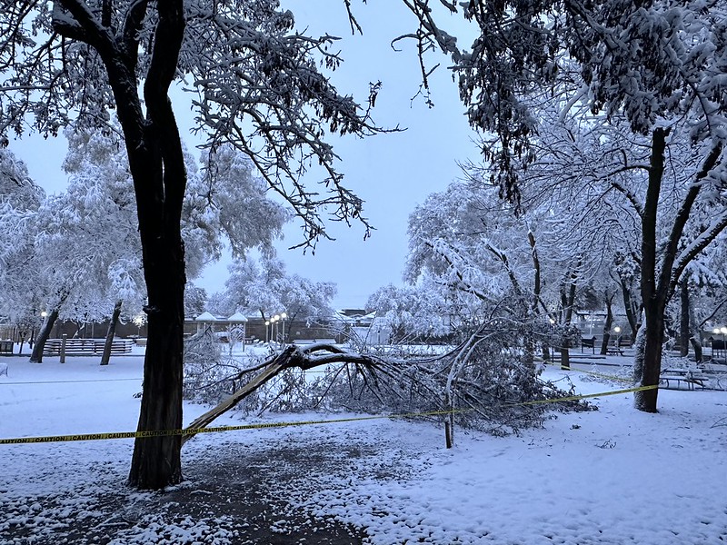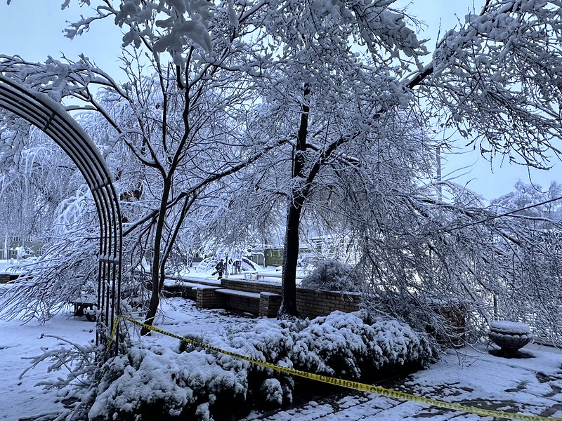 The weather has been bouncing back and forth between winter and spring this week. On Wednesday, Tashkent received a heavy, wet snow of several inches. Many tree branches came down all over the city, including on our campus. Fortunately, the snow fell overnight, and the big branches were already down by the time the students and teachers got to school. The maintenance team did a good job of securing the area under the trees that were at risk of more branches falling and clearing away the downed branches. The physics behind this natural phenomenon fascinates me. Can an arborist look at a tree and identify which branches are susceptible to cracking with the extra weight of snow on them? I had a very busy day at school and I wasn’t able to enjoy the snow much, but I did snap a few photos in the morning below of damaged trees on our campus.