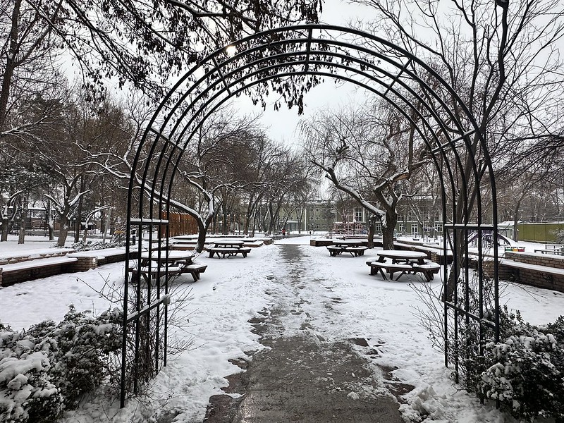 Hopefully, we have had our last snowfall of the year. We received several inches of snow on Sunday and Monday this week. It was a lighter snow than the previous storm, so no downed trees. Temperatures remained cold for a few days until the sun melted the snow by the end of the week. I was careful walking on the icy sidewalks going to a dentist appointment (photo right), and the snow enhanced the view from The House Garden (left) at school.
