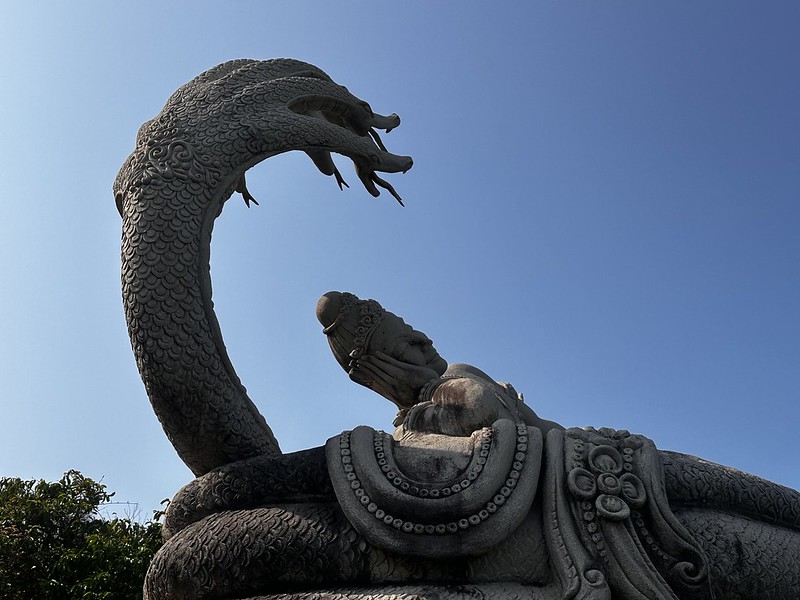 The statue depicts a seven-headed serpent protecting a reclining Buddha. In Buddhist theology, “Mucilinda” is a “nāga” (half-serpent/half-human divine being) King Mucalinda provided shelter to the Buddha from a storm by covering the Buddha’s head with his seven snake heads.