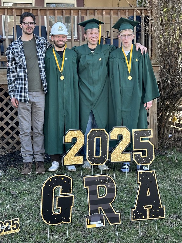 It was an awesome day for the Kralovec family! Our eldest son Owen graduated from Northern Michigan University on Saturday. The ceremony was held in the Superior Dome, aka “Yooper Dome” and it is one of the largest wooden dome structures in the world. It opened in 1991 and can seat up to 16,000 people. Thankfully, the ceremony was held indoors as it was a cool and windy day, although no snow flurries like on Friday. It takes a long time to announce 1000+ names, and luckily, Owen was near the front so we didn’t have to stay for the whole ceremony. Owen celebrated with a four-finger gesture signifying he finished his degree in four years. I took 5 years to complete my Bachelor’s degree as did my two brothers. Thank you Owen for saving us a year’s tuition!