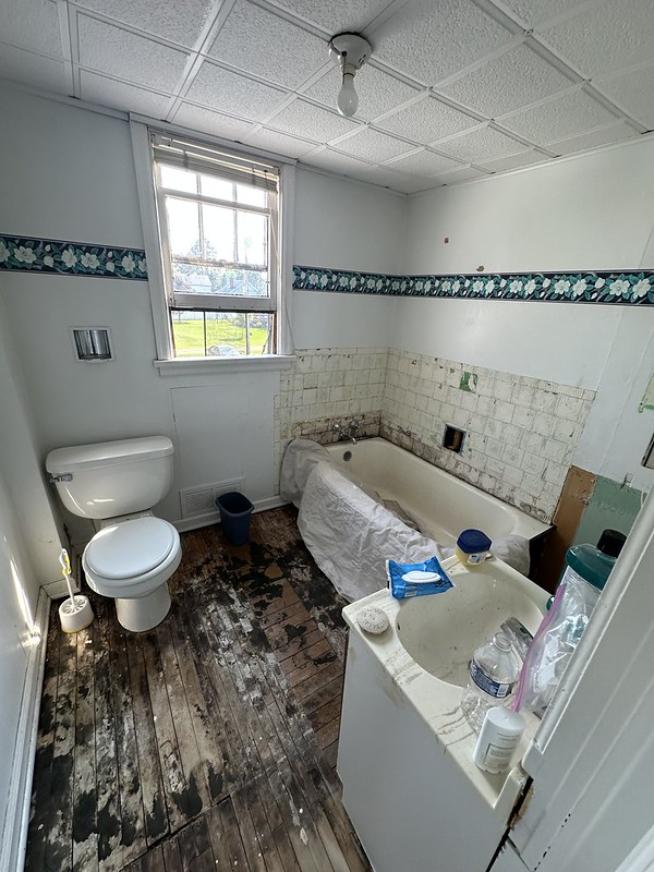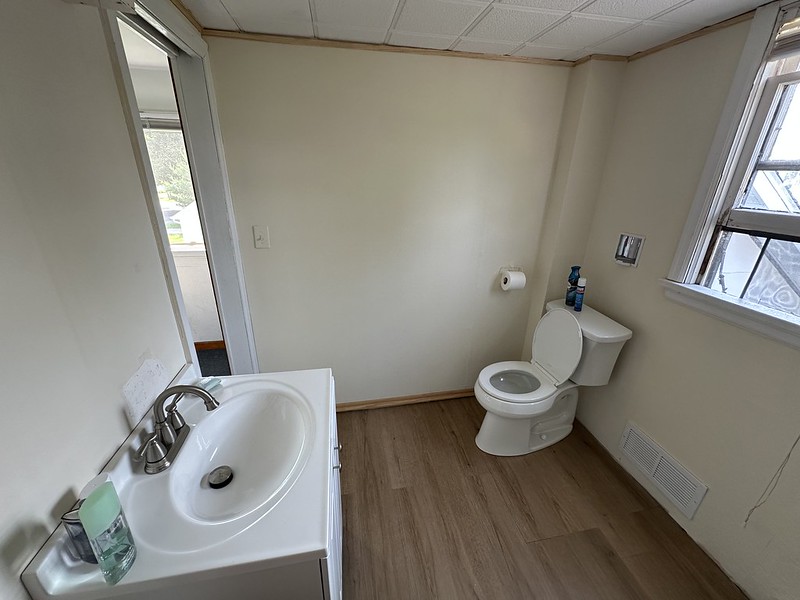 The home renovations continue and I wanted to post an update on the second floor bathroom. Because we couldn’t find a plumber to do it, we did it ourselves. My brother can do basic plumbing and carpentry so it directed the project and did the more complicated parts. We put in new flooring, patched and painted the walls, added floor trim, a new sink, vanity, mirror, and toilet. All we have left is the shower.