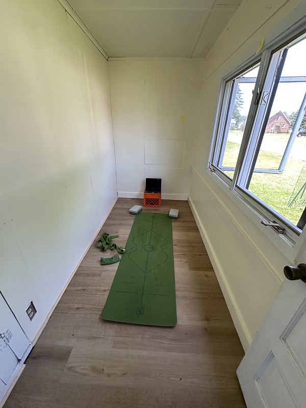 We installed laminate flooring in the porch. I cut plywood sheets, and our neighbor, Rocko, drilled them to the asbestos siding that was on the left side of the photo above. We are putting in new windows this fall to give it more light and air. The room is not heated, so we probably wouldn’t use it in the winter if we were here, but during the late spring, summer, and early fall, it will be a nice room to do yoga in. I used to sleep in the room as a kid during the summers because our second floor was too hot. We don’t really get hot weather so often, and many of the homes in the Upper Peninsula, especially the older ones, don’t have central air conditioning.