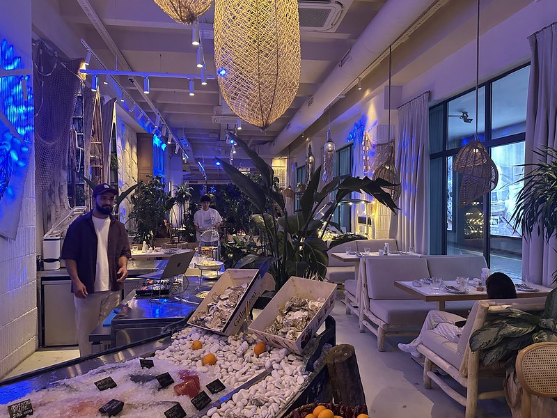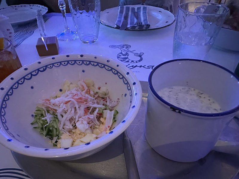 With this being our last year in Tashkent, I’ll be blogging a bit more about the city and country. We had a fabulous welcome dinner at the Kaspiyka Restaurant. It is one of several Russian chains that opened restaurants in the city. Kaspiyka specializes in seafood and fish cuisine and started in Kazan, Russia. Six years ago, it was difficult to find a nice restaurant; today, there are numerous. My favorite dish was a Russian cold soup called Okroshka. Kaspikya added crab to the basic ingredients of diced cucumbers, radishes, potatoes, and hard boiled eggs. The ingredients are mixed with kefir (кефир), a fermented milk that is tangy and has a consistency between milk and yoghurt. There are two locations in the city. We ate at the Shevchenko Street location, that had a live DJ playing.
