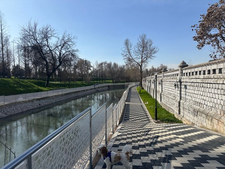 The city improved the pathways along a canal that runs between the Ring Road and the Sacred Heart Catholic Church, also in the area. I noticed city officials are creating nicer walking paths along the various canals that run through the city. The next step would be to try to connect the pathways to create longer routes and loops. They could also publish route maps and promote Tashkent as a city great for walking. I also took a cool photo of four classic early 1980s Soviet apartment complexes. The four 19-story apartment blocks form a half circle around Hamid Olimjon (Uzbek poet) Square, named after the train station underneath. Some people think they are an eyesore, but I like them.