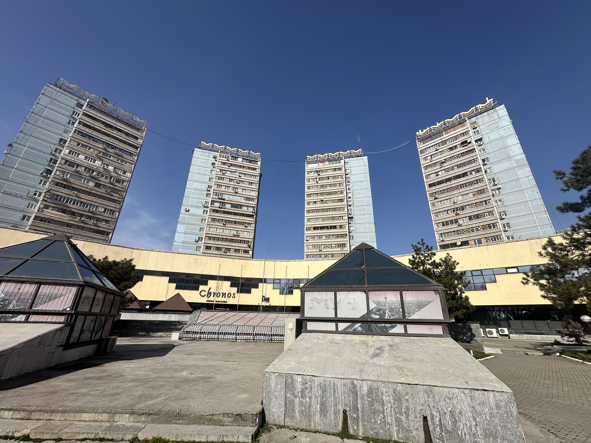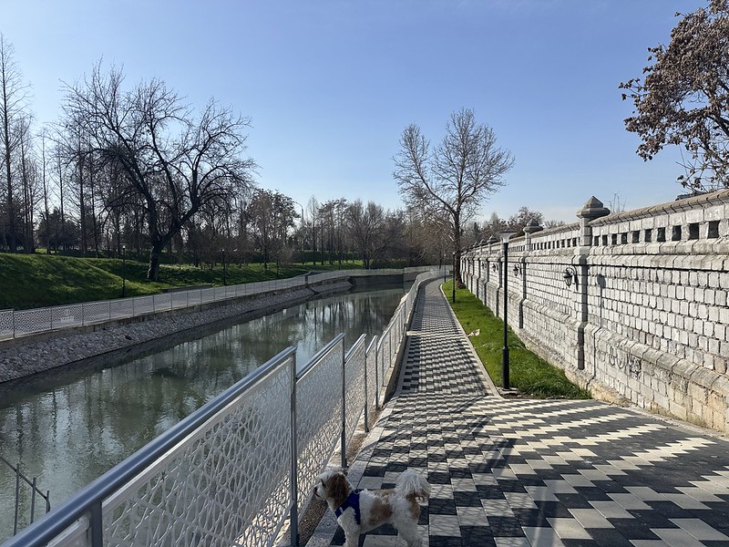 The city improved the pathways along a canal that runs between the Ring Road and the Sacred Heart Catholic Church, also in the area. I noticed city officials are creating nicer walking paths along the various canals that run through the city. The next step would be to try to connect the pathways to create longer routes and loops. They could also publish route maps and promote Tashkent as a city great for walking. I also took a cool photo of four classic early 1980s Soviet apartment complexes. The four 19-story apartment blocks form a half circle around Hamid Olimjon (Uzbek poet) Square, named after the train station underneath. Some people think they are an eyesore, but I like them.