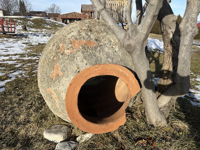 • 2022 Vinoterra Mtsvane – Vinoterra is the brand used by Schuchmann when they produce the wine in qvevri. This was my favorite wine of the three we tasted. The amber wine had a complex taste, including being stored in an oak barrel after being produced in the clay vessel. We scored it an average of 8.35.