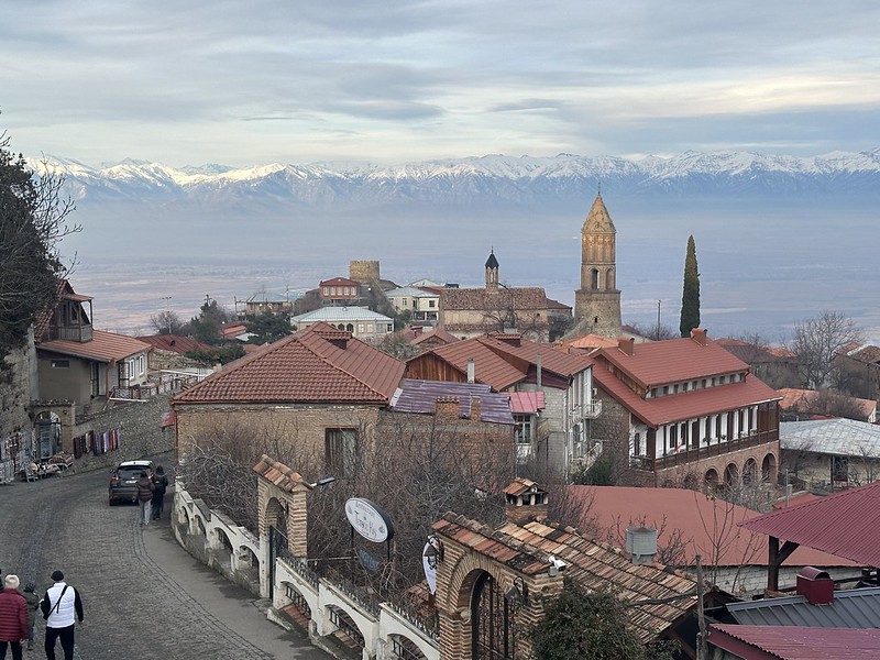 In the afternoon, we drove to the tourist town of Sighnaghi. It is located on a steep hill overlooking the Alazani Valley in the heart of Georgia’s wine-growing region. King Heraclius II of Georgia commissioned a fortress on this high ground in 1762 to protect the town from marauding Dagestani tribesmen coming over the beautiful Caucasus Mountains. The town is probably nicer in the summer. It was cold and muddy, but we did have an exquisite meal at the Pheasant’s Tears Winery.